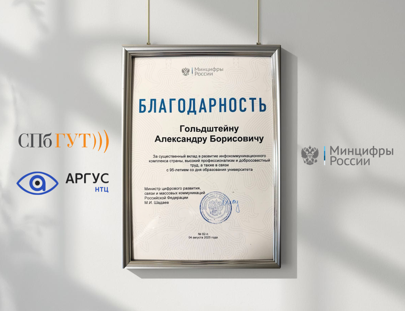 Состоялось вручение Почётных грамот и Благодарностей от Министра цифрового развития, связи и массовых коммуникаций Российской Федерации Максута Шадаева представителям отрасли, внесшим значительный вклад в развитие инфокоммуникаций. Награждение приурочено к празднованию 95-летия СПбГУТ им. проф. М.А. Бонч-Бруевича.